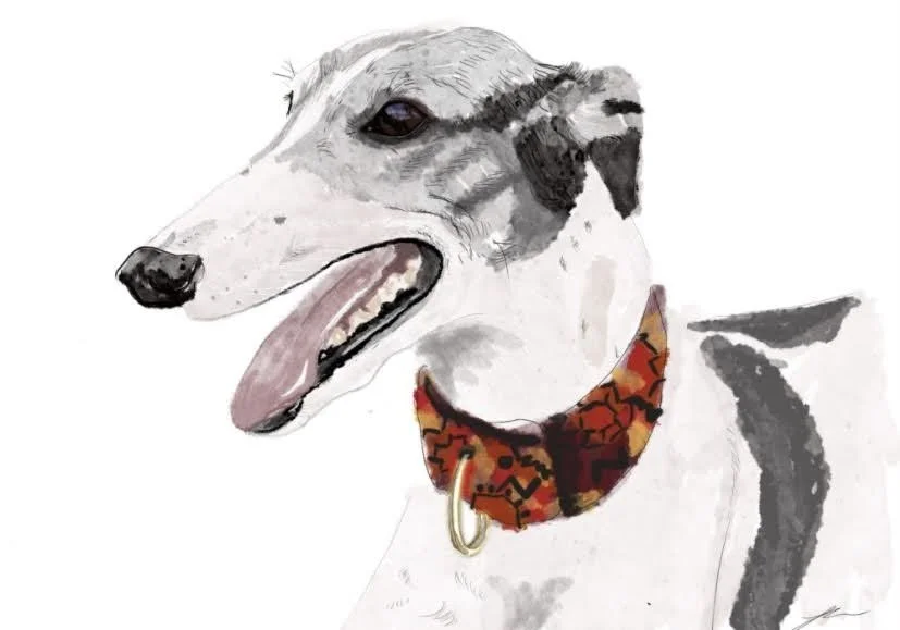 "Spot", 2022 Hand drawn, digital pet portrait of Spot the Greyhound. A special remembrance portrait 🕊